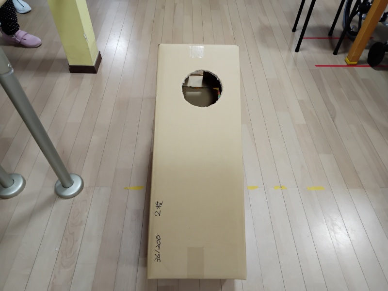 お手玉をボードに投げて、穴に入れば100点ボードに乗れば10点。ボードに乗ってもすべり落ちてしまいます。ハラハラドキドキのゲームとなりました。