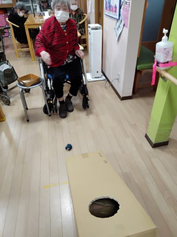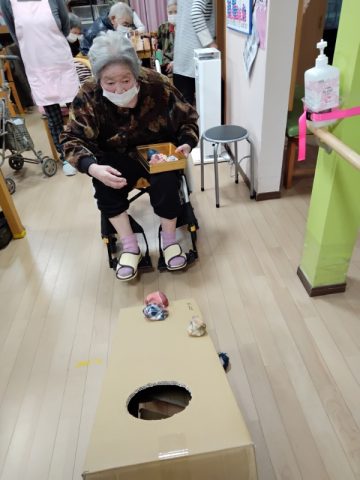 今日のレクは「コーンホール」ならぬ「お手玉ホール」