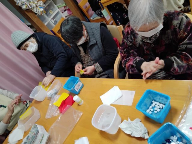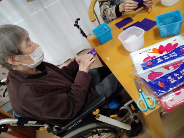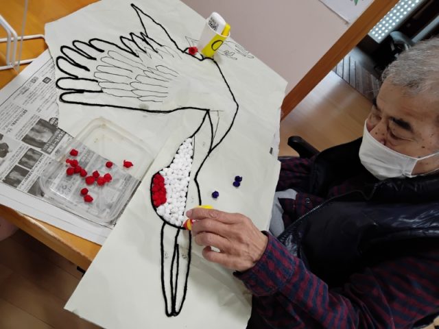 皆さんで玄関先に飾る鶴の製作活動を行っています。皆さん日々コツコツと頑張って作っています。完成するのが楽しみです。