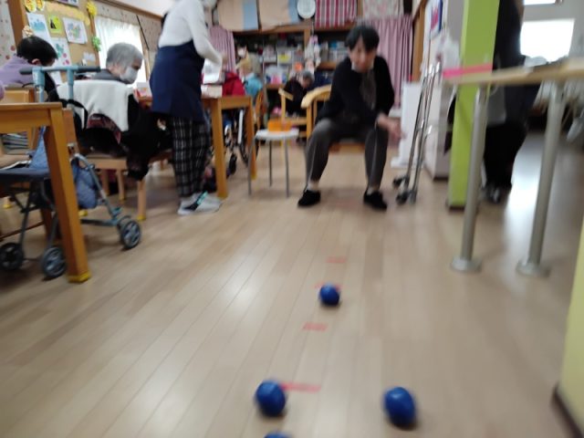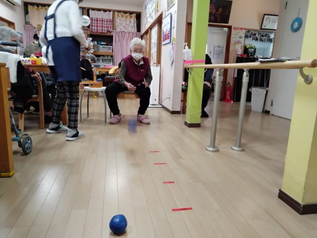 午後のレクリエーションは負荷のあるボチャボールを投げることによって上肢の可動域訓練になりました。