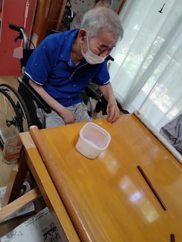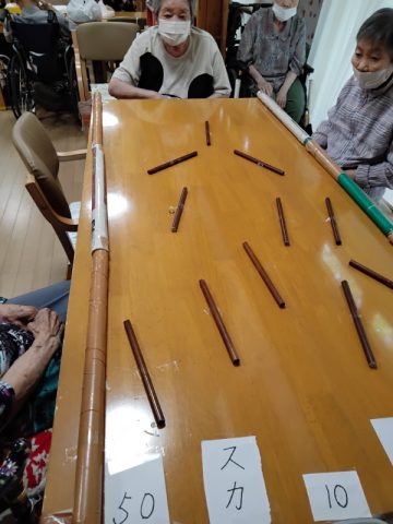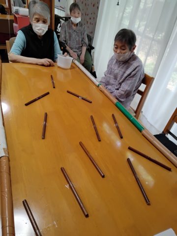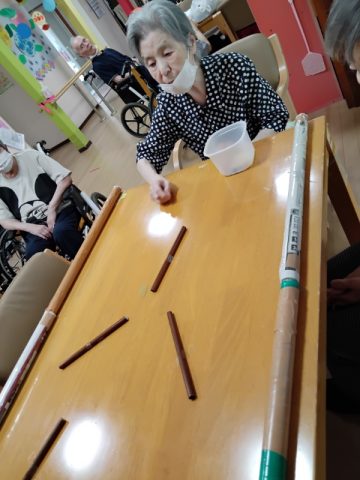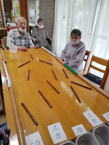 今日のレクリエーションはビー玉転がし得点ゲームです。