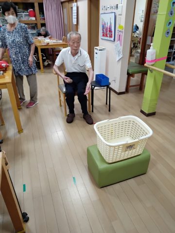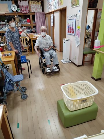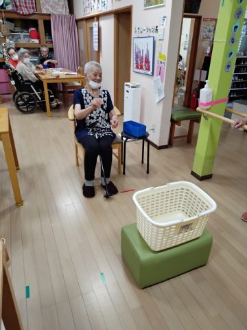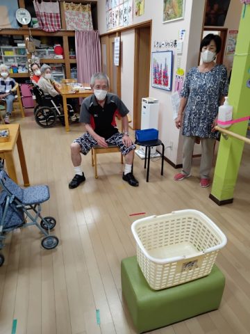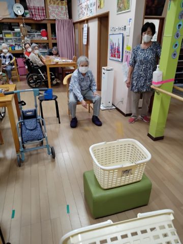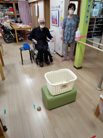 今日のレクリエーションはカゴ入れゲームです。