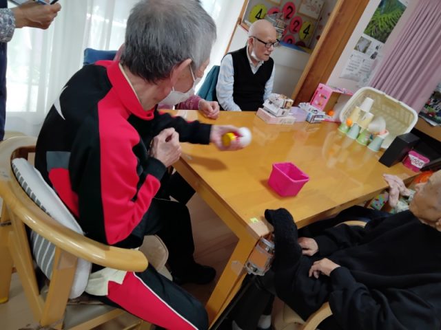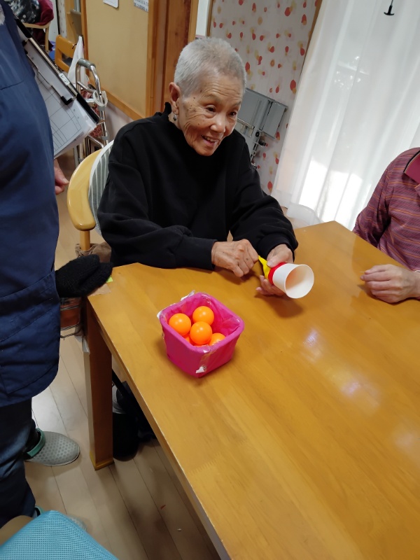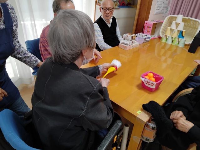 今日のレクリエーションは紙コップ射的ゲームを行いました。