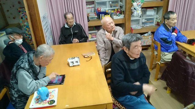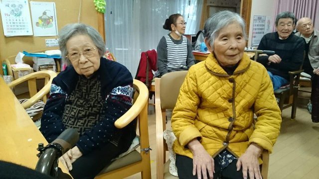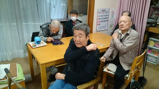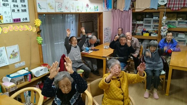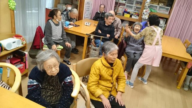 今日の午後は、どんぐりころころ、サザエさん、雪山讃歌、線路は続くよどこまでもなどなど、歌を歌いながら手や足を動かす体操をみんなで行いました