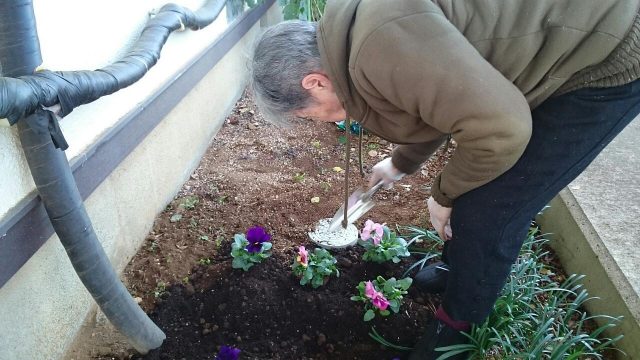 12月7日はクリスマスに向けての飾りをみんなで作りました。いろいろなサンタクロースにトナカイが完成しました。トナカイは海外の動物だから目の色は黒じゃないと色を染めている方もいました。 玄関先の花壇にパンジーの花を植えました。