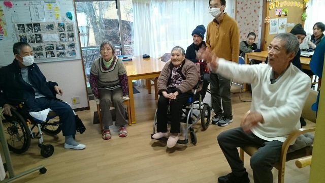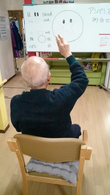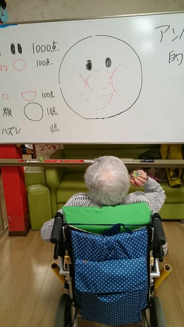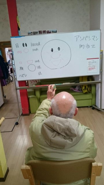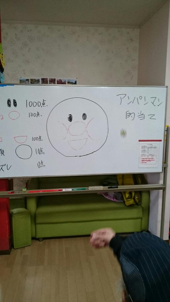 今日のレクは「アンパンマン的当てゲーム」。 ホワイトボードにアンパンマンを描いてもらいました。 鼻と口に当てたら100点。顔は10点。そして目に当てたらなんと1000点! 1000点獲得した方がお一人いらっしゃいました。 的になったアンパンマンさんごめんなさい。
