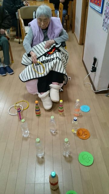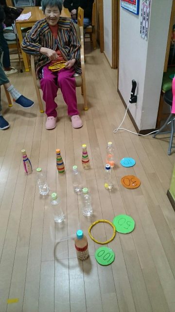 ひなたでは定番の輪投げ。 今回はボウリングのピン状態にペットボトルを並べて得点を競いました。 1列め10点2列め30点3列め50点、そして一番遠いヘッドピンは100点。 見事100点ゲットされた方もいらっしゃいました。