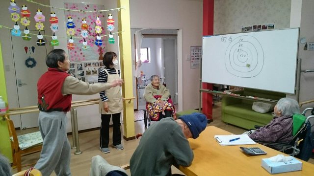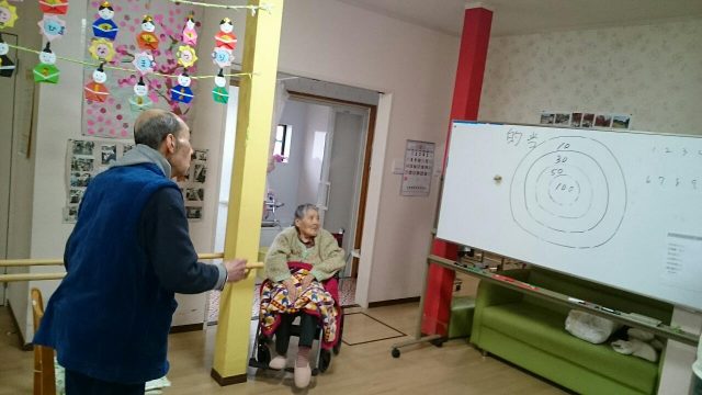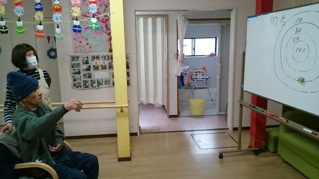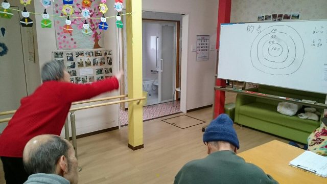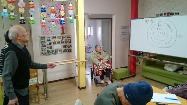 ひなたでは定番のゲームです。 オーバースローの方、下から投げる方いろいろです。 立って投げられる方、車イスの方それぞれのレベルに合わせて楽しむ事ができます。 2月もあとわずか。トップ賞はどなたの手に渡るでしょうか。