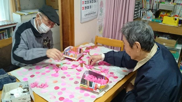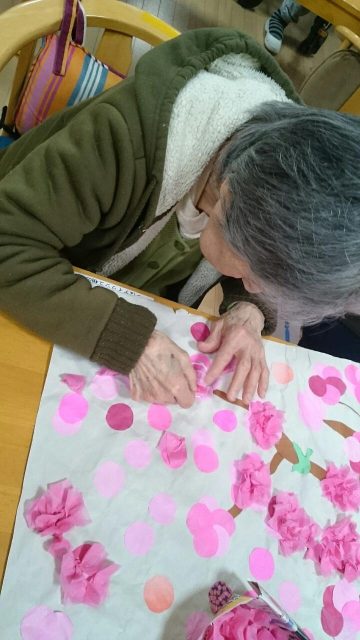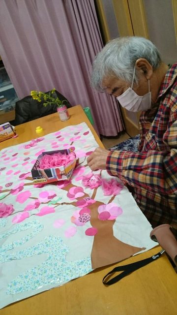 久し振りにカラオケ大会を行いました。 普段唄わない方もマイクを握って熱唱されていました。 カラオケに参加されなかった方は桜の木の作成物に取り組んでいただきました。桜が満開です。