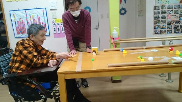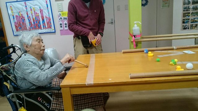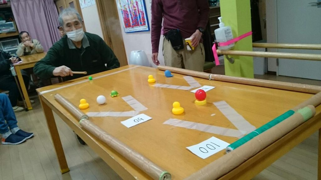 4月最初のゲームレクです。 題して「コロコロひっつきゲーム」。 障害物を乗り越え転がしたピンポン玉状のボールをテープにひっつければ得点。 皆さん高得点をあげていました。 ゲーム終了後3月の上位3名様の表彰式を行いました。 景品は普段食べないお菓子。 4月も入賞目指してがんばりましょう。