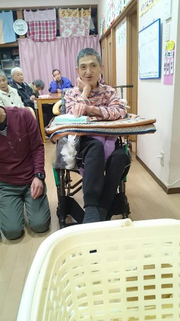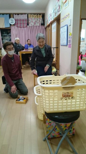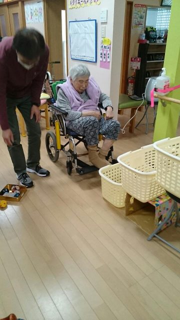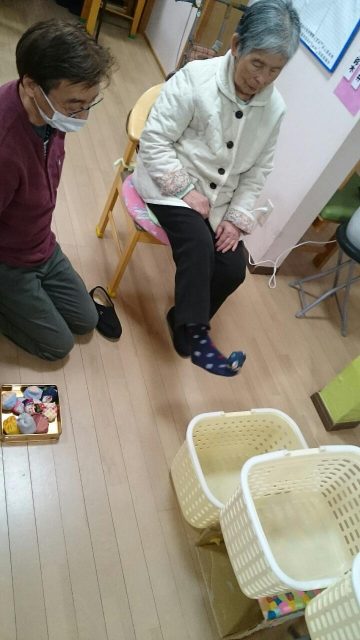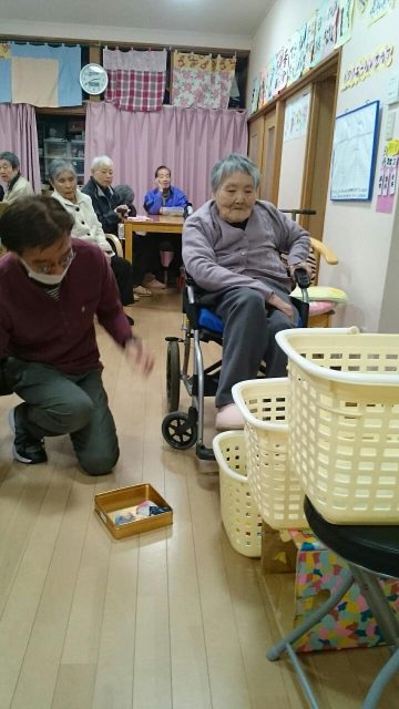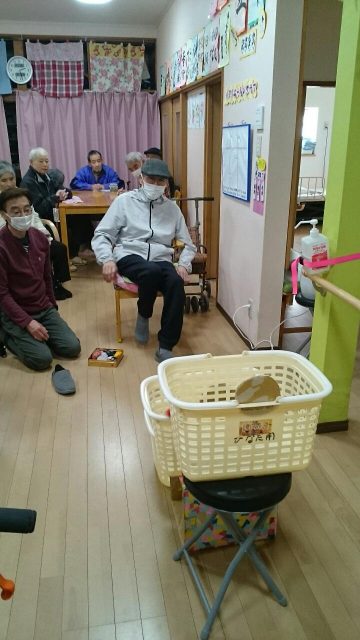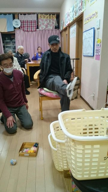 足を使ってお手玉をかごに入れるゲーム。 かごは3つでそれぞれ100点500点1000点! レク担当スタッフが試したところまったく入りません。 これは難易度高い!と思っていたら、1000点連発の利用者さんもいらっしゃいました。