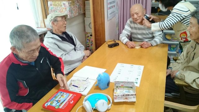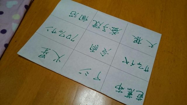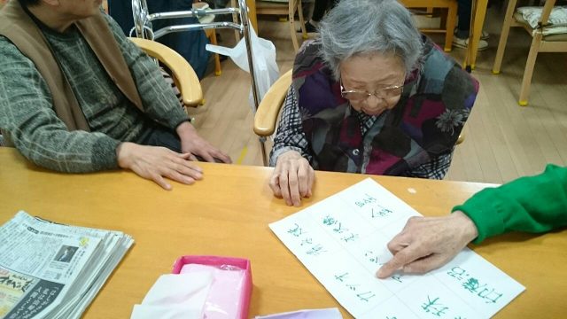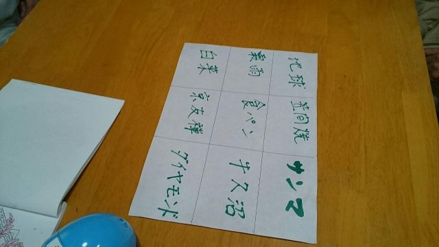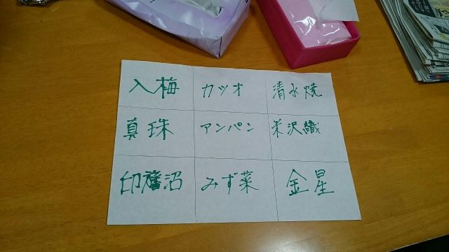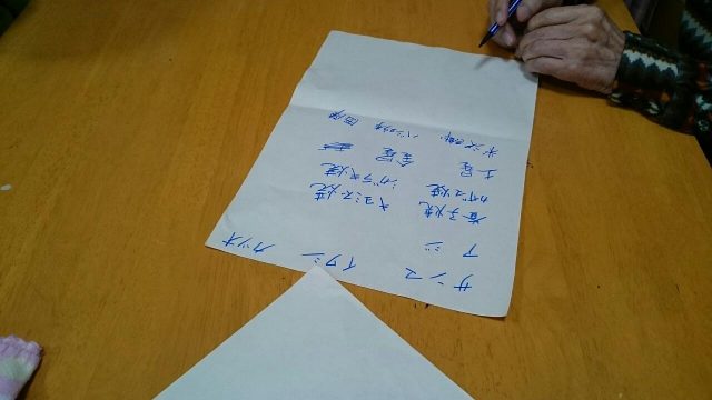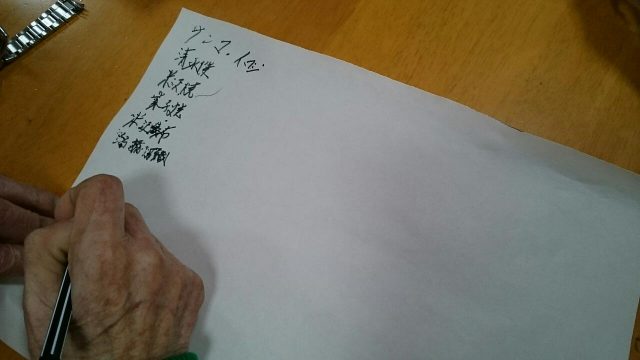 テーブル対抗記憶力ゲームを行いました。 魚、パン、雨の種類、織物、宝石、沼、野菜などの名前が入った紙が4枚。テーブルごとに1枚回渡してそれを順番に回して行きます。合計4枚記憶してもらいます。 それを紙に書いて行きます。最後に答え合わせ。 テーブルごとに協力しあって頭をひねって書いていただきました。 「こんなのわかんないよ~」という言葉もいただきました。 頭を使うとけっこう疲れますね。
