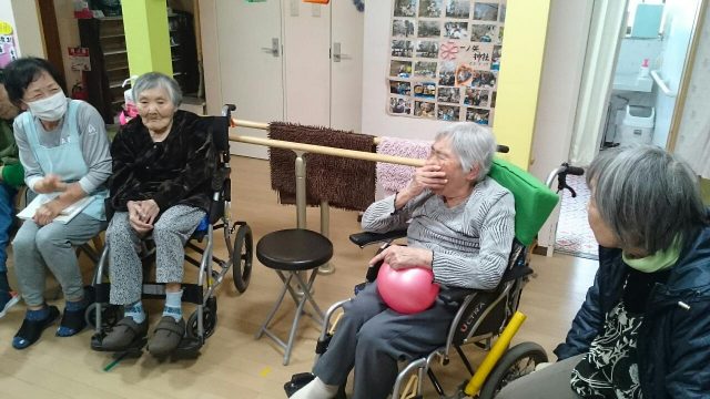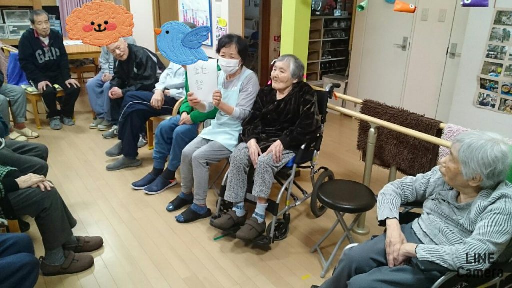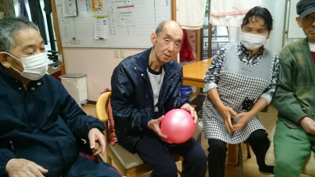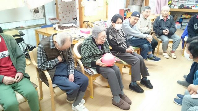 全員が輪になってひとつのボールを回します。 「ピカピカ」で右回し、「ゴロゴロ」で左回し。 「ドスン」でボールを持っていた方が当たり。 当たった方はお題に答えていきます。 好きな食べ物だったり生まれ故郷の事だったり歌を歌ったり尻文字を書いたり難読とんち漢字を答えたり。 全員参加のレクは久しぶり。楽しい時間を過ごしました。