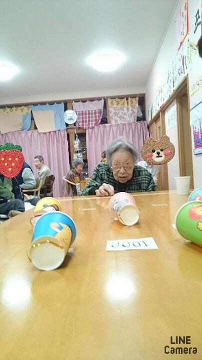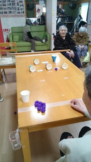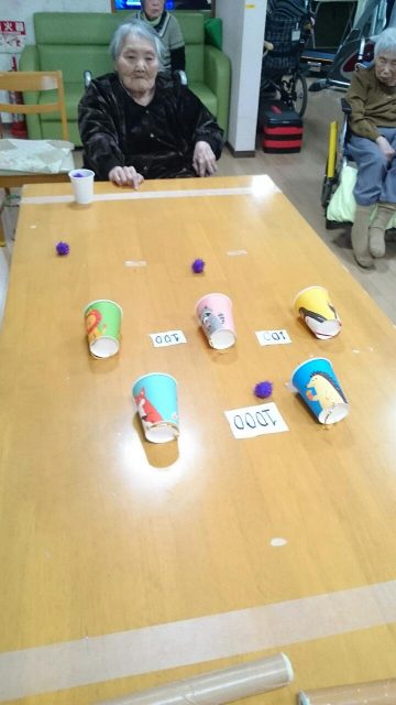 モールをおはじきのように指で弾いて紙コップに入れるゲーム。 指先の微妙な感覚が試されます。 モールは真ん丸ではなく思ったように飛びませんが、見事にホールインワンの利用者様多数でした。