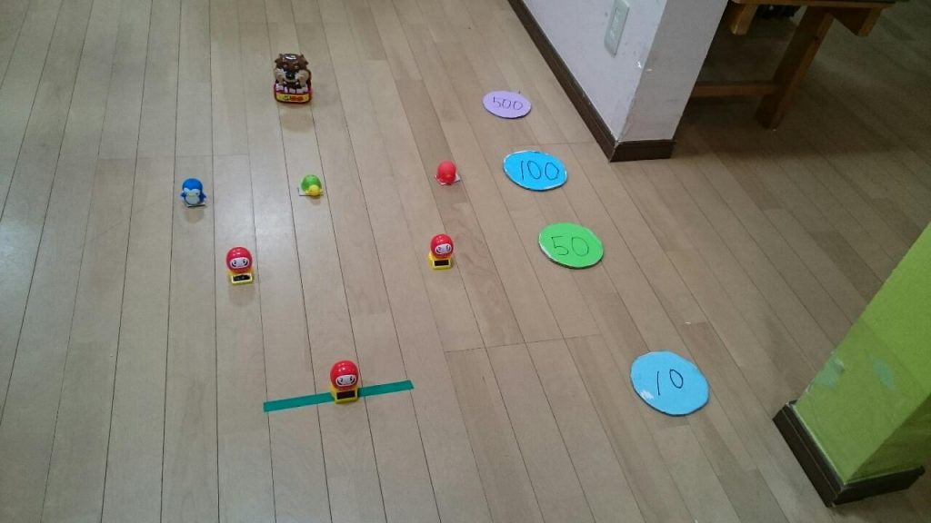 小物を並べて輪投げを行いました。最高得点500点を出す方多数!