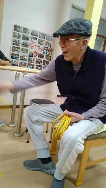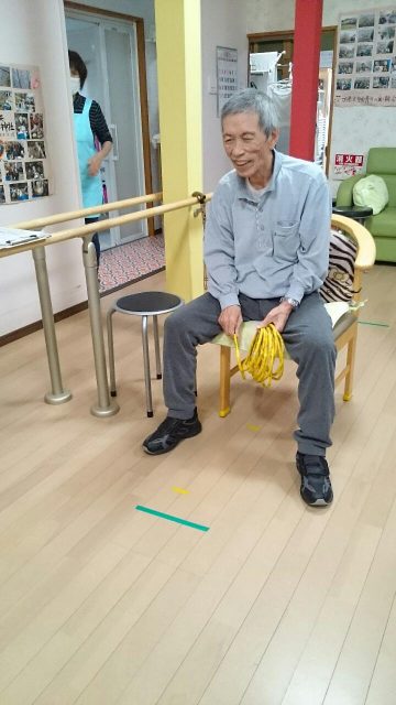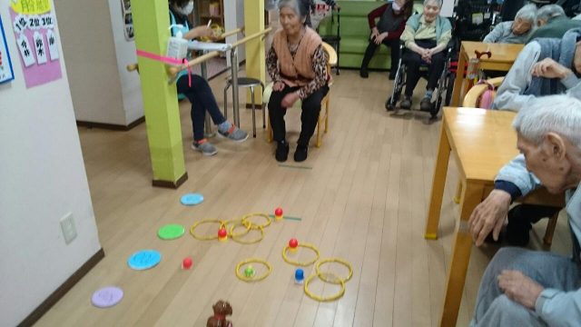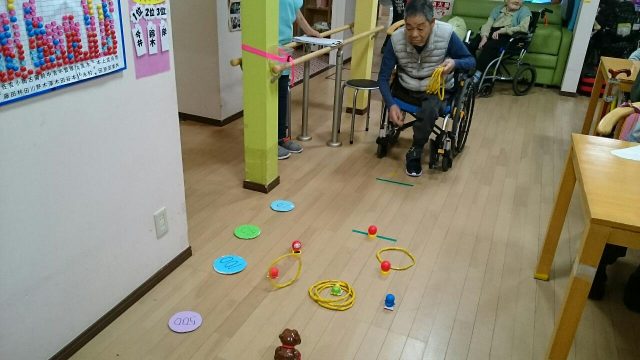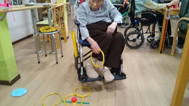 今日のレクは「定番輪投げ」