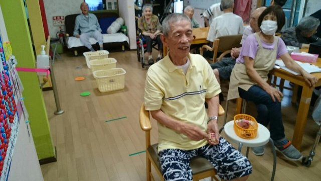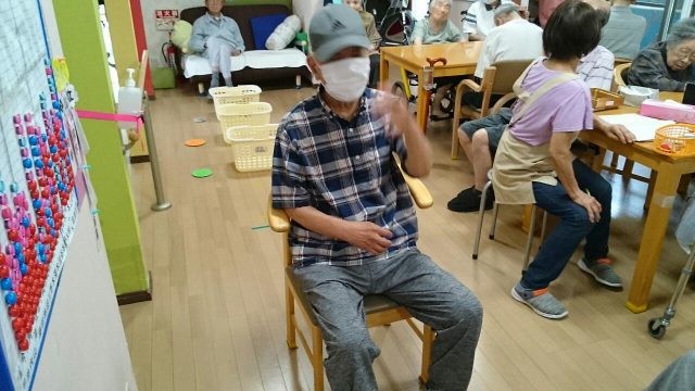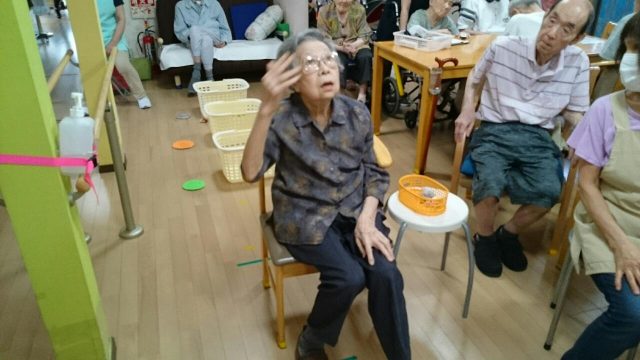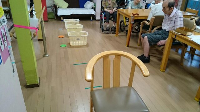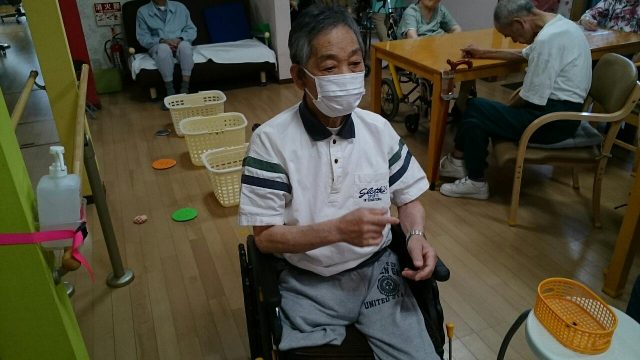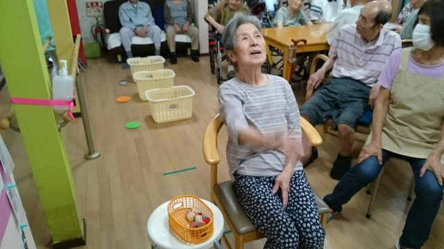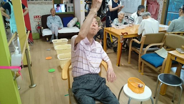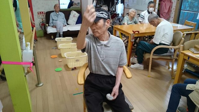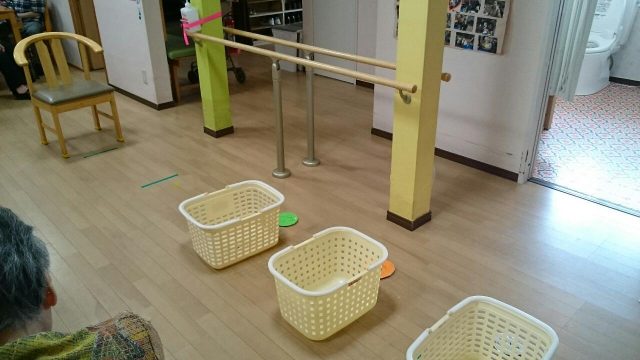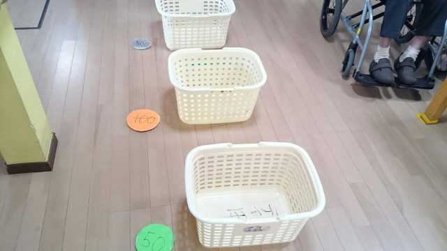 後ろ投げでお手玉を投げてかごに入れるゲーム。 後ろに投げるのが困難な方は前から投げます。 後方が見えないので皆さん苦労されていました。 見事一番難しい500点かごに入れた利用者さんがお一人いらっしゃいました。