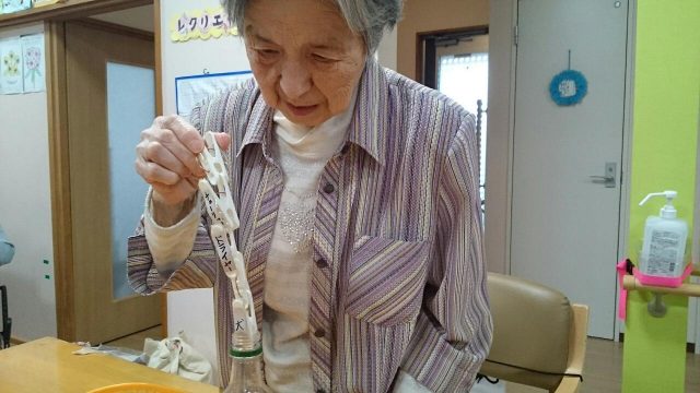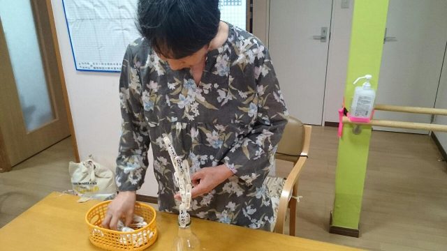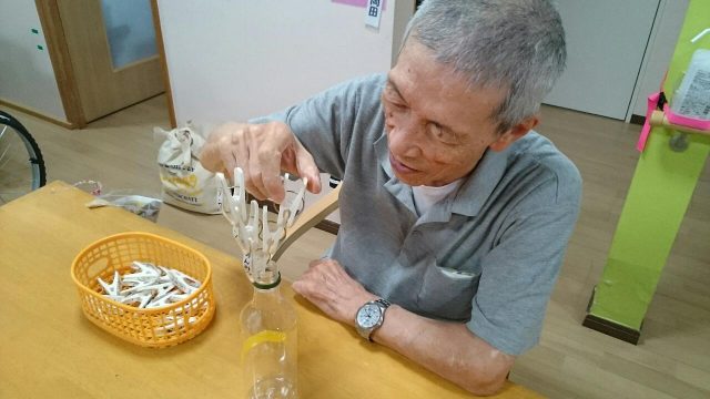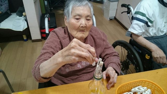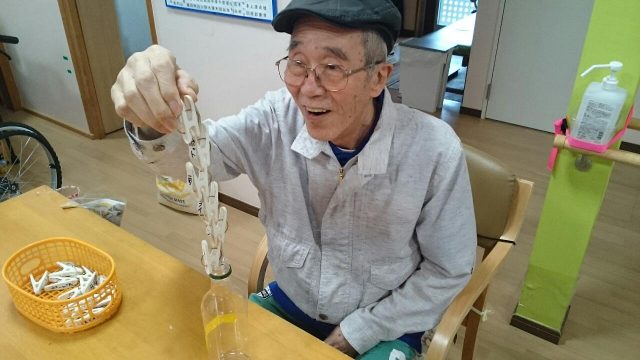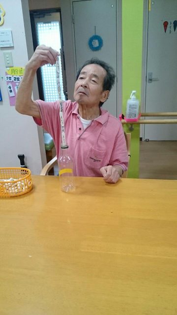 ペットボトルに洗濯ばさみをはさんで積んでいくゲーム。ペットボトルを倒さずに1分間でいくつ積み上げる事ができるでしょうか。 単純だけど盛り上がったかな。