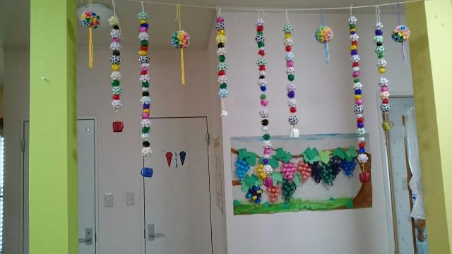 近くの歯医者さんから素敵な折り紙をたくさんを頂きました。 頂いた折り紙を使用し、利用者さんとスタッフで玄関前の壁飾りを作ったり、吊り飾りを作りました。玄関先が素敵になりました。 折り紙のコースター 使用してみるといつものお茶も華やかになりました。