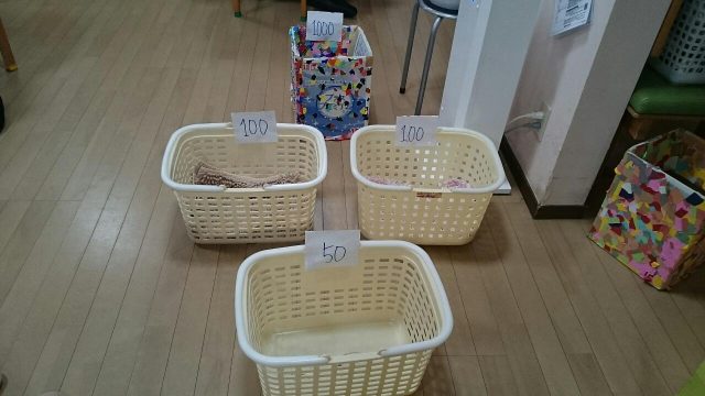 新聞紙を丸めたボールをうしろ向きに投げてかごに入れます。 一番遠い箱に入れるとなんと1000点。 これに2回入れた方が優勝でした。