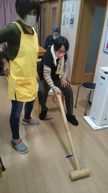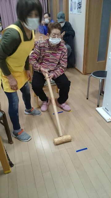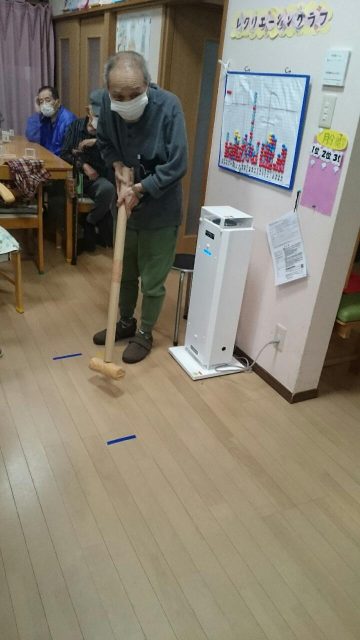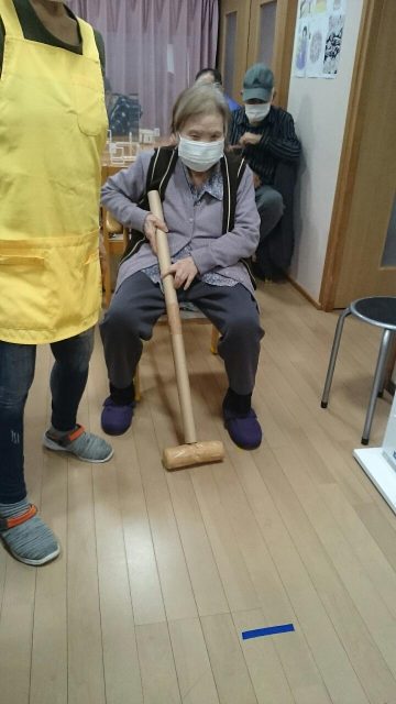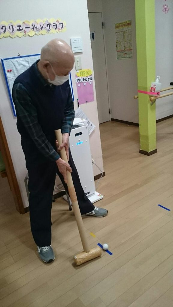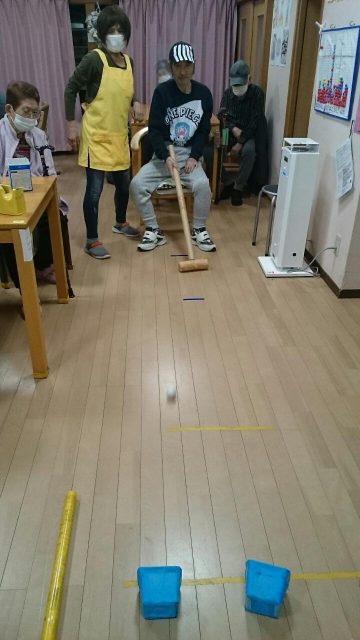今日のレクリエーションはなんちゃってゴルフ。皆さん狙いを定めて盛り上がりました😊
