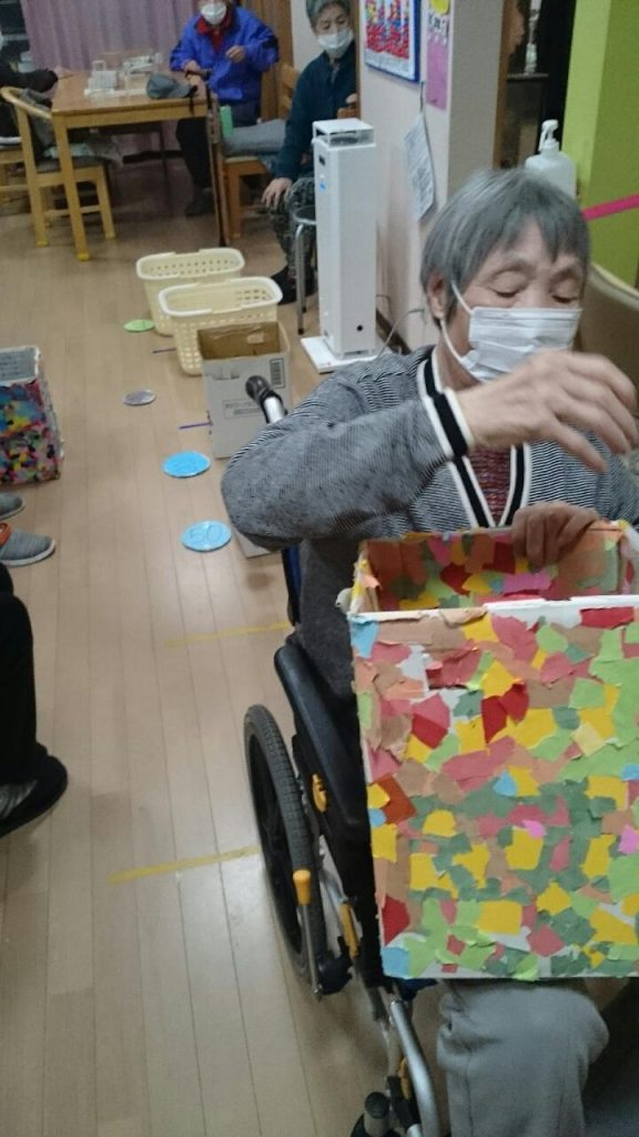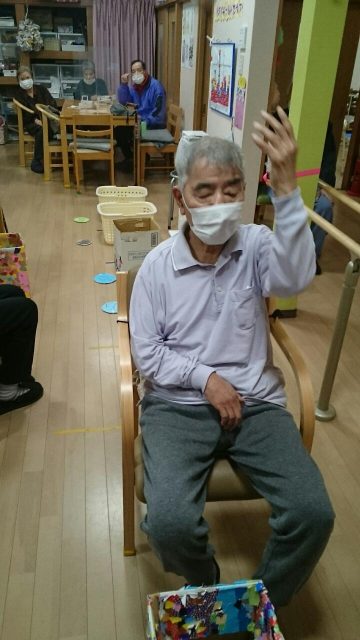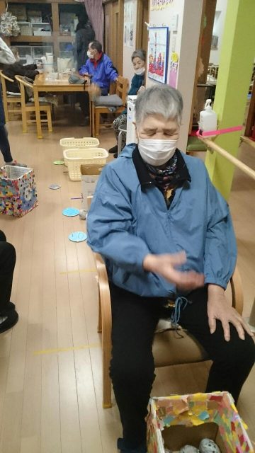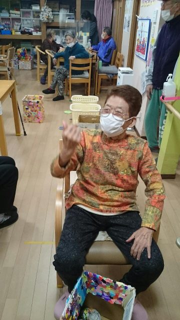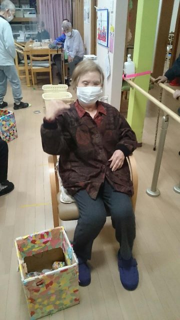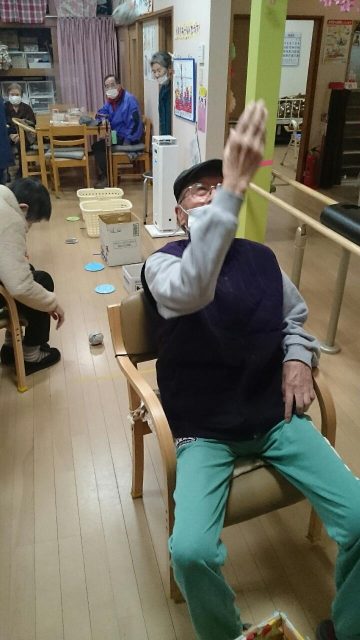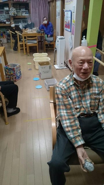 ひなた定番のゲームです。うしろ投げで新聞紙ボールをポイっと投げて的のかごに入れます。今日は女性陣大活躍でした。