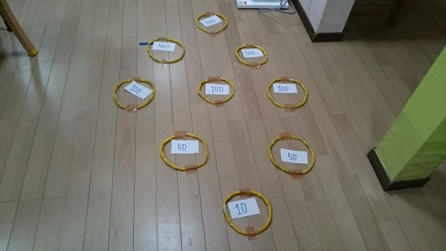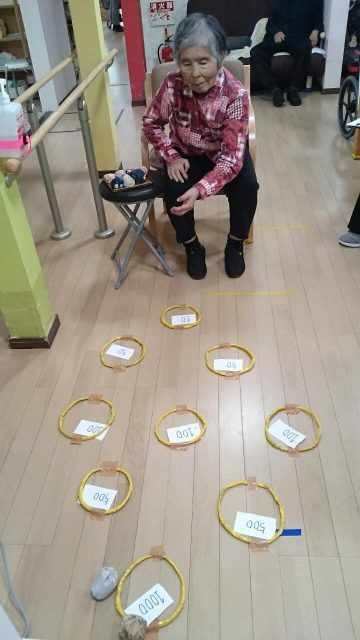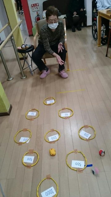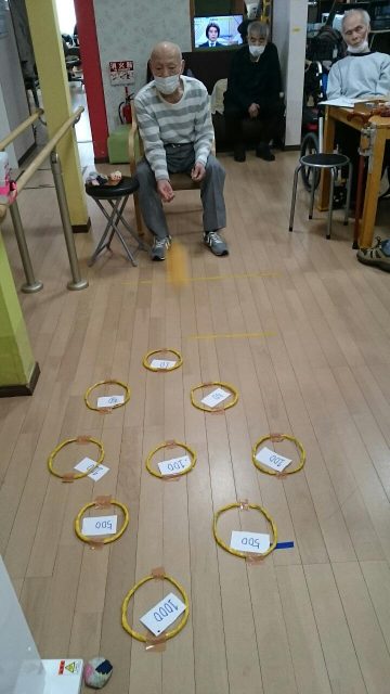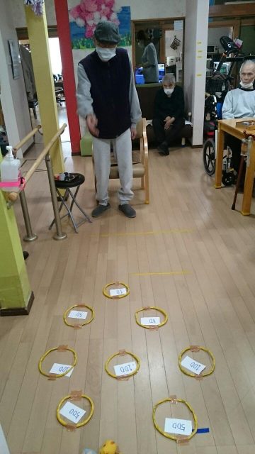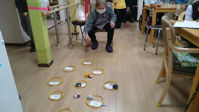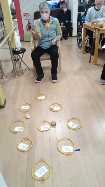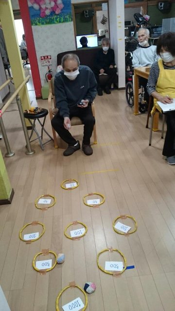 今日のレクは「輪っかにお手玉入れますゲーム」