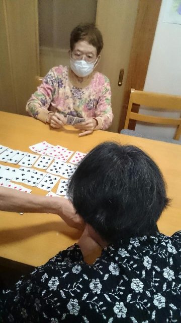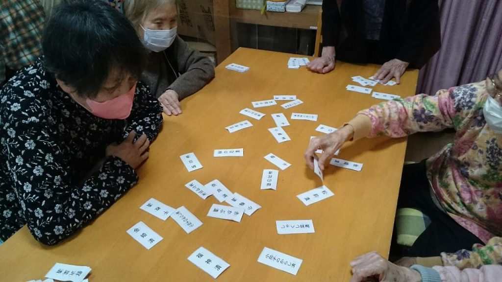 今日の午後は男性テーブル女性テーブルに分かれて、それぞれ漢字パズル、漬け物の名前合わせ等を行いました。「この漬け物はなーに」等の会話も弾みました。その後はトランプで楽しんでいました。