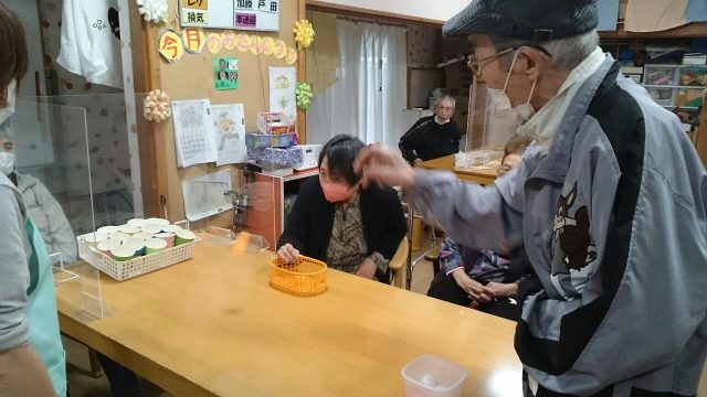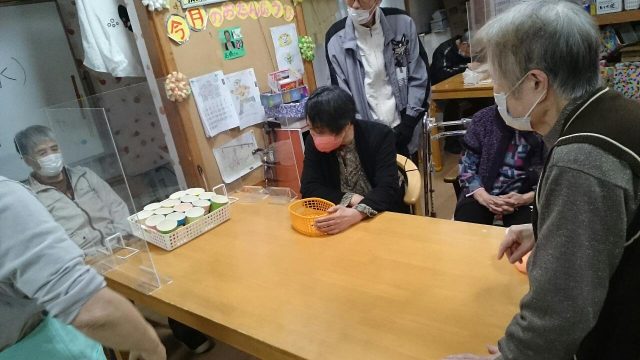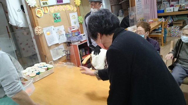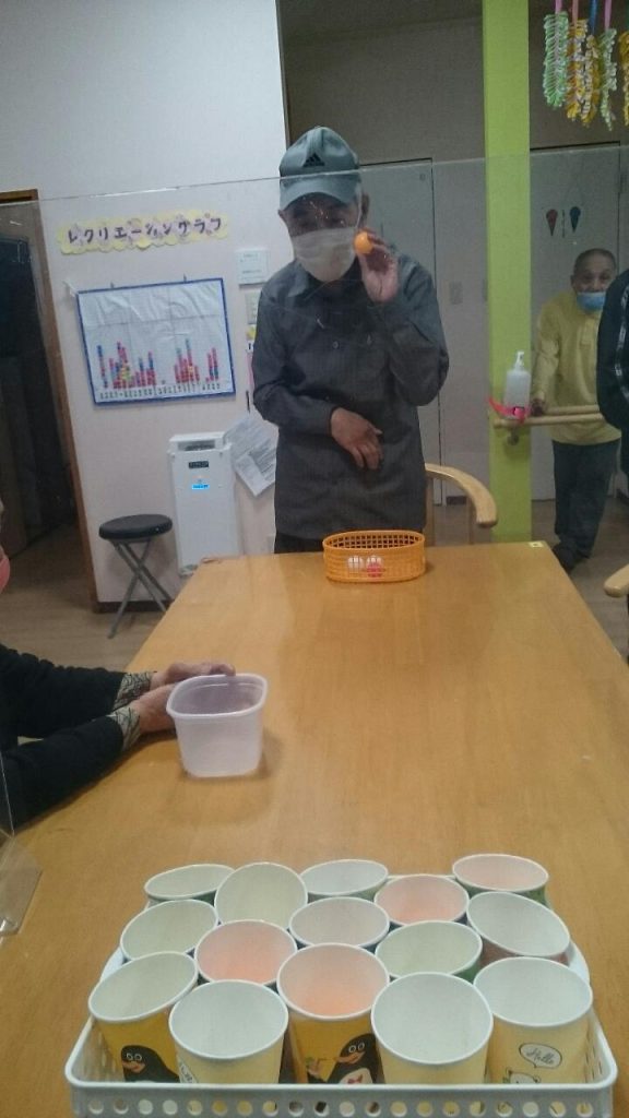 本日のレクリエーションは、ピンポン玉を使用した得点ゲーム♪ ピンポン玉をバウンドさせてカップインするゲーム みなさん盛り上がりました。