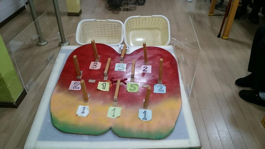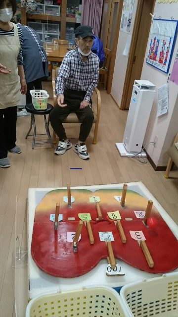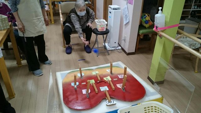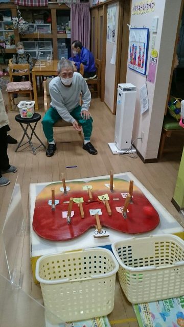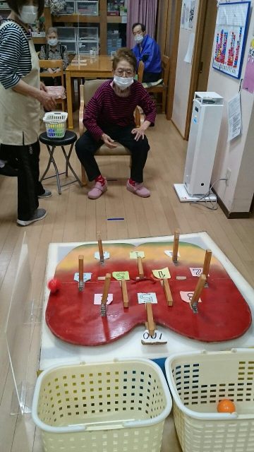 障害物を乗り越えてボールを転がして、その先にあるかごに入れるゲーム。 見事にボールが入れば得点です。力が弱かったり障害物に跳ね返されると「出戻って」しまいます。 力加減を考えながら上腕を使う運動となります。入った時の達成感を味わう事ができます。