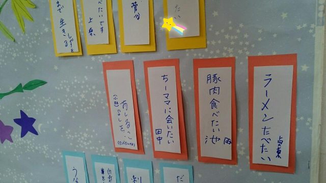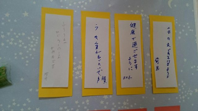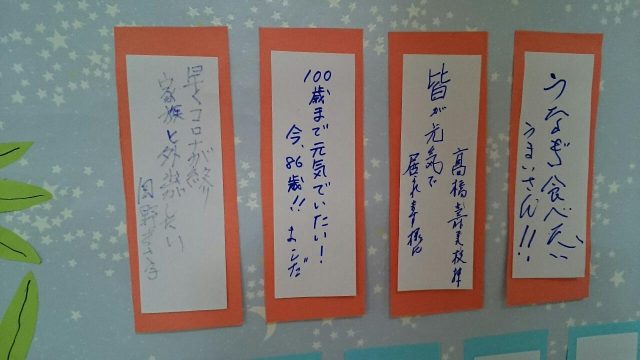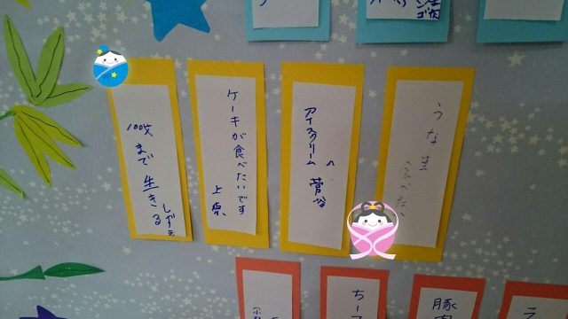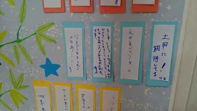 もうすぐ七夕です。皆さんにそれぞれ短冊🎋に願い事を書いてもらいました。 願いが叶いますように(*^▽^)/★*☆♪