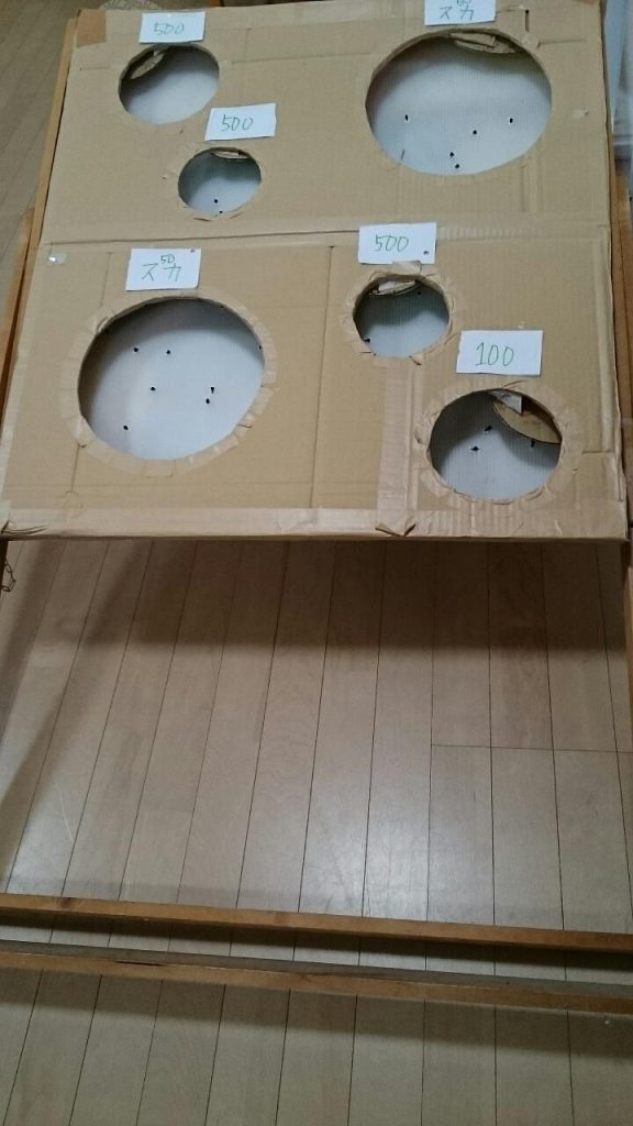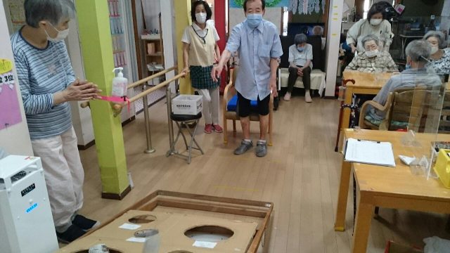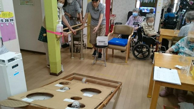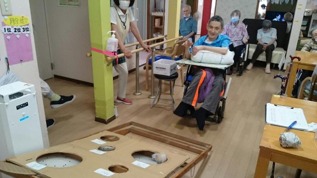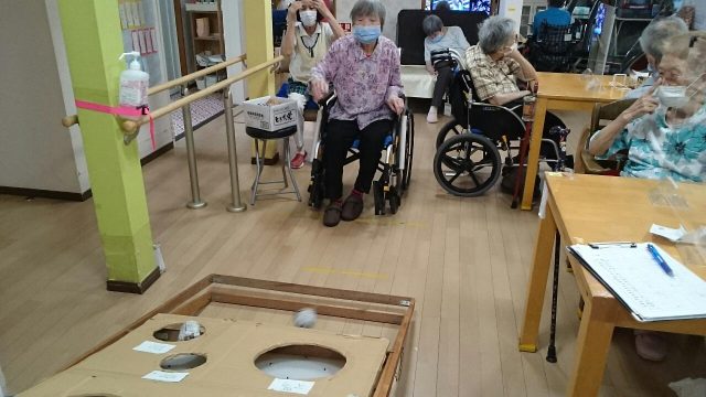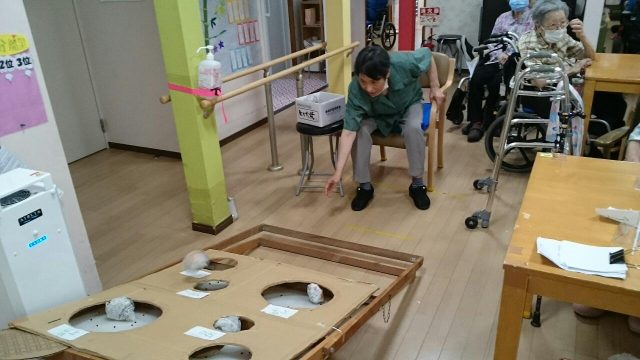 ホール目掛けて新聞玉を投げて入れるゲーム。勢いが付きすぎると転がって行きます。上手く入れる事ができるでしょうか。