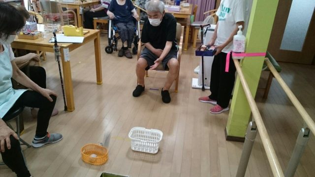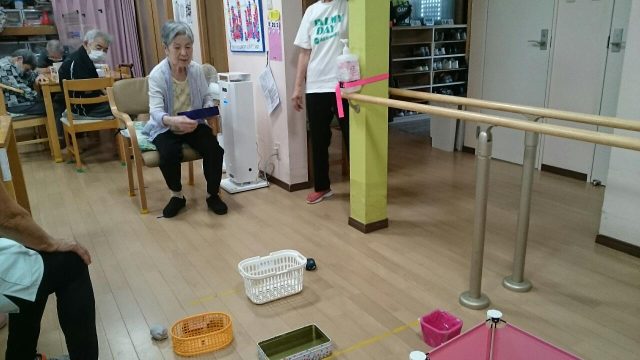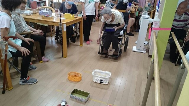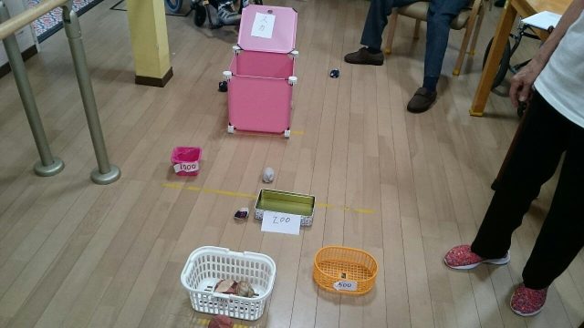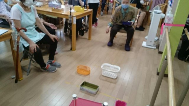 今日のレクは「お手玉的入れゲーム」