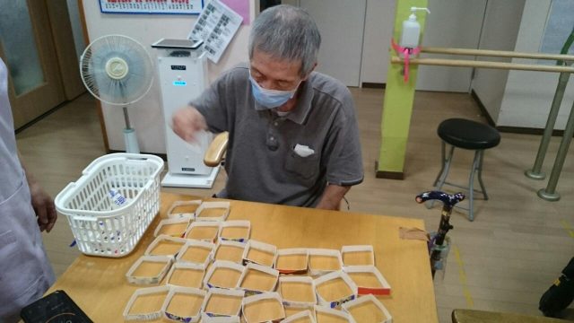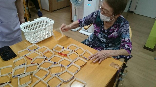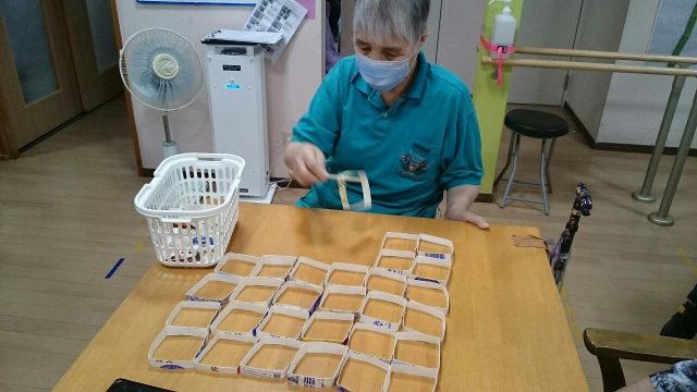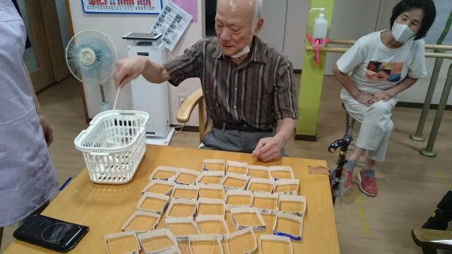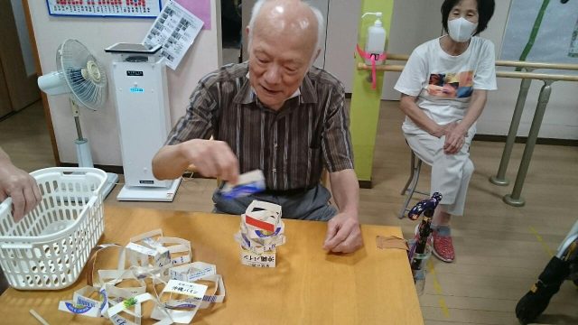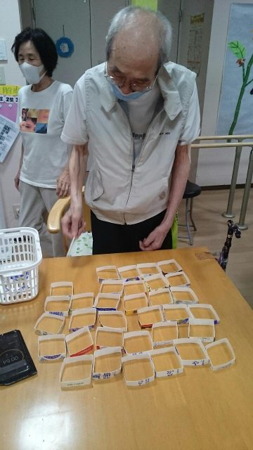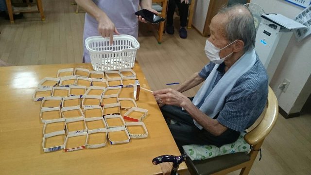 牛乳パックを使った「たこ焼きひっくり返し積み上げゲーム」を行いました。