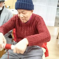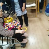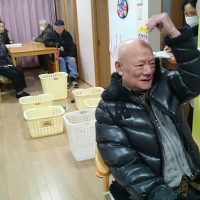 題して「後ろから前から的入れゲーム」。 お手玉をかごめがけて前投げと後ろ投げで投げていただきました。 難易度高め。後ろ投げで高得点を上げる利用者様もいらっしゃって歓声が上がってました。