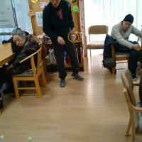 本日のレクは「ビリヤード的入れゲーム」。 テーブルを2台つなげて的を作り、ビリヤードのキューに見立てた棒でボールを弾きます。見事的の中で静止すれば得点! ゴムボールはどこに転がるかわからない面白さがあります。盛り上がりま …