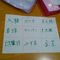 テーブル対抗記憶力ゲームを行いました。 魚、パン、雨の種類、織物、宝石、沼、野菜などの名前が入った紙が4枚。テーブルごとに1枚回渡してそれを順番に回して行きます。合計4枚記憶してもらいます。 それを紙に書いて行きます。最 …