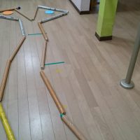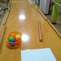 先日の「寸止めビー玉転がし」の倍の距離をビリヤードよろしくキューでボールを突いて止めます。テーブル2台つなげて大がかりになりました。 力加減が難しく、止まると思ったら転がっちゃったりして盛り上がりましたよ。