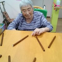 後ろ投げでお手玉を投げてかごに入れるゲーム。 後ろに投げるのが困難な方は前から投げます。 後方が見えないので皆さん苦労されていました。 見事一番難しい500点かごに入れた利用者さんがお一人いらっしゃいました。