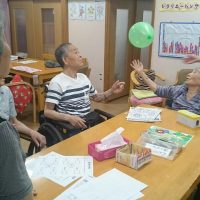 今日の午前中は、1つのテーブルに集まり風船バレーを行いました。