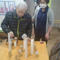 今日のレクは「お手玉筒のせゲーム」