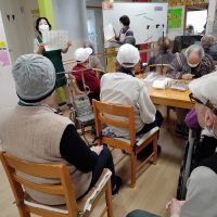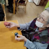 今日のレクは「コーンホール」ならぬ「お手玉ホール」