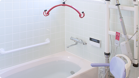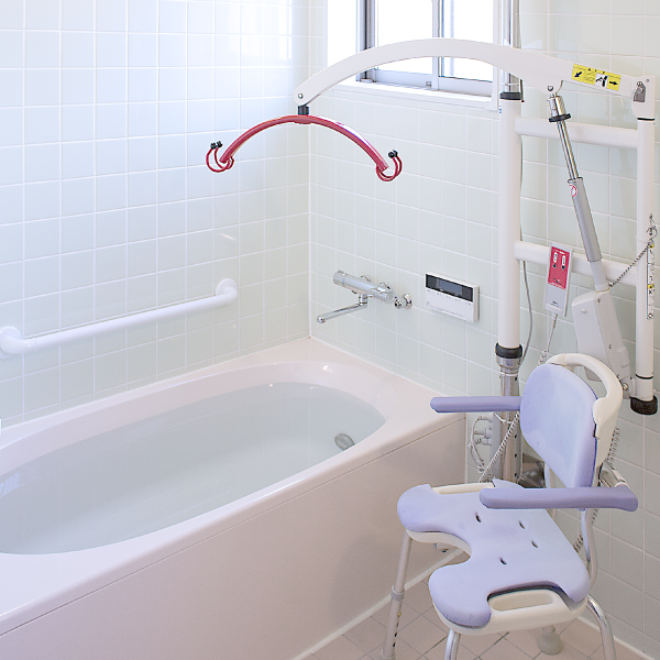 ご入浴は、個人のプライバシーを第一に考え、個浴でご利用いただけます。また、歩行困難な方や車椅子の方には特殊な機械を使ってご入浴できます。個別機能訓練は、作業療法士による身体と心のリハビリを行います。